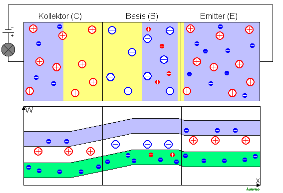 - Image - Situation $U_{CE}=0V, U_{BE}=0V$: In this picture the unpowered transistor is shown. In it the free charge carriers (electrons in blue, holes in red) and the junction layers between base and emitter, and base and collector in yellow. Only the junction layer shows the stationary charge carriers with their sign. As shown in the band model, the stationary charge carriers are present everywhere in both doped regions.